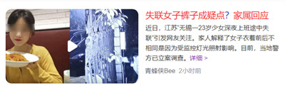 有網(wǎng)友提出疑問,這是同一個人嗎?衣服怎么會變沒了,或者說黑褲子變成了肉色的?隨后姑娘的親屬表示:“衣著是沒有問題的,監(jiān)控顯示的那一塊很黑,她彎著腰,紫外線照著她,把上衣和褲子都照成了白色” 。
